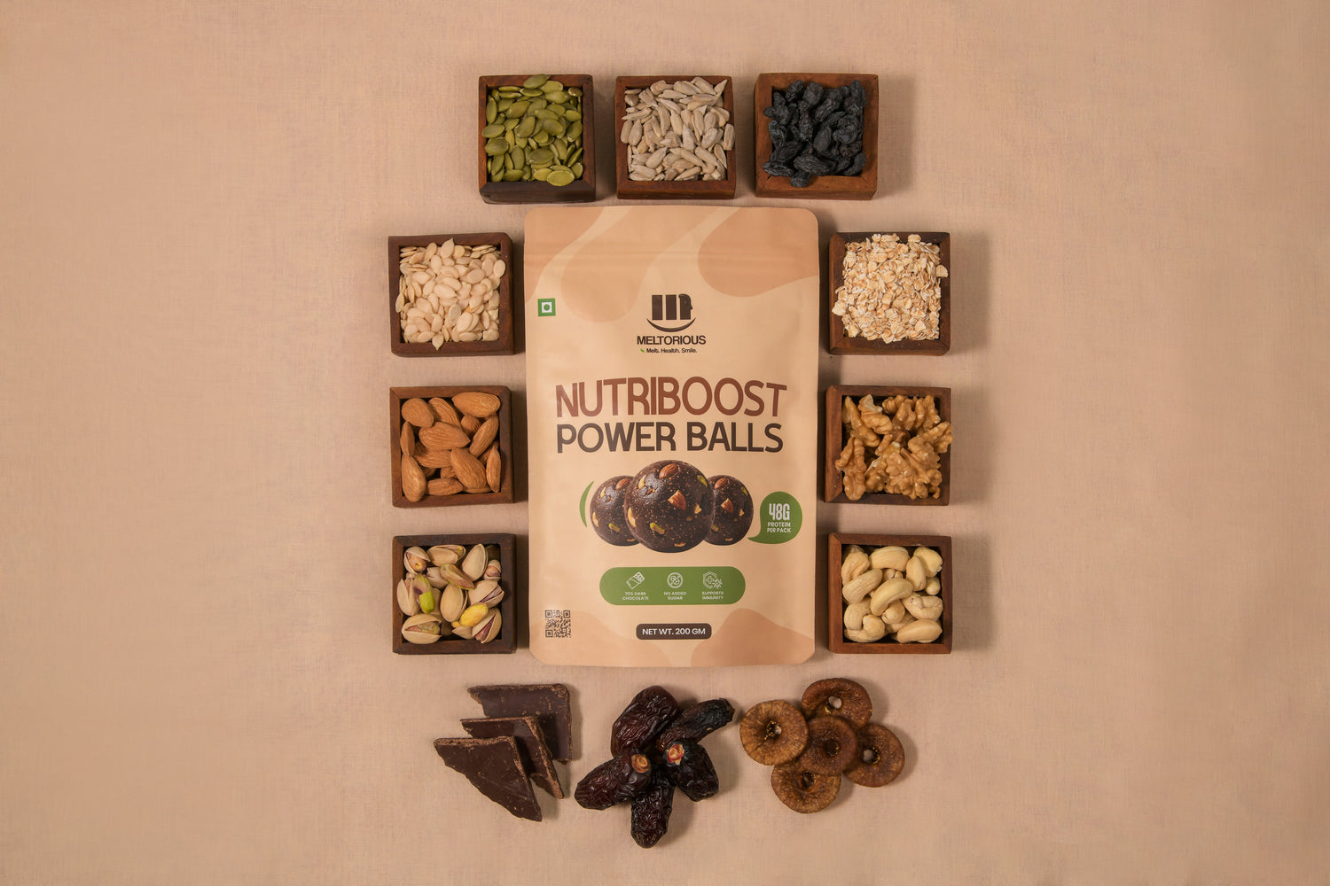 I created our NutriBoost Power Balls to be the ultimate solution: a Hunger-crushing blend of 70% Dark Chocolate, premium Nuts, and Seeds, sweetened only by Nature. We’ve ditched the refined sugar to give you clean Energy that Fuels your ambition without compromising your Health.